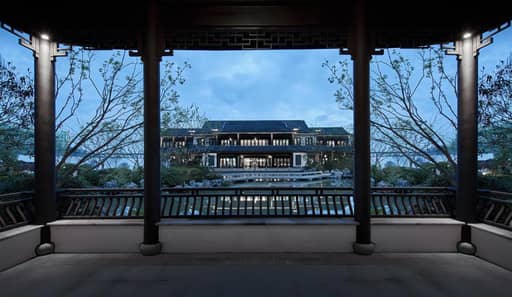 东方美学的“气韵”是缥缈且难以物化的,因此设计继承并优化了传统山院的形制,将借景、对景等传统造园手法融入项目的中式合院区,通过漏窗、月洞门、门廊等使被分隔的空间发生渗透,以形成分而不隔、穷而不尽的视觉体验。鸟瞰整个园区,如同一幅疏密相间、张弛有度的水墨丹青,缱绻地将环境纳入麾下,赋予场地轻盈的流动感与鲜活的生命力。